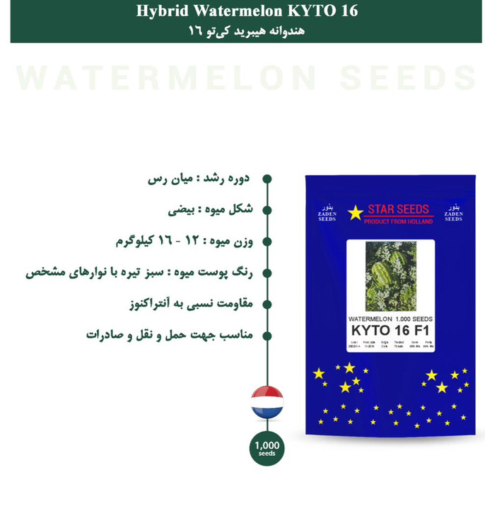 بذر هندوانه کریمسون سوئیت کی تو 16 رقمی میان رس، پربار و با ماندگاری بالا است که شرکت استارسیدز آن را تولید میکند. این محصول از بوتههای بسیار قوی با پوشش وسیع شاخ و برگی برخوردار است. تیپ میوه بیضی شکل است، شکل و اندازه یکنواخت دارد و وزن آن حدود 10 تا 12 کیلوگرم است. محصول پوسته بسیار ضخیمی دارد و به همین جهت قابل حمل به نقاط دوردست و صادرات است. بذر هندوانه کی تو 16 محصول شرکت استار سیدز رقمی هیبرید و زودرس است. و به عنوان رقم بذر هندوانه کریمسون سوئیت هیبرید با عملکرد بالا معرفی شده است. بذر هندوانه کریمسون سوئیت کی تو 16 رقمی زودرس و مناسب کشت فضای باز به صورت نشاء است. میوه رقم کی تو 16 شباهت بسیاری به رقم کی تو 12 دارد. با این تفاوت که بذر هندوانه کی تو 16 حدود 1 الی 2 روز نسبت به کی تو 12 دیرتر میرسد. این بذر هندوانه در طی سالهای متمادی در کنار هندوانه کسری، کی تو 12 و B32 در مناطق جنوبی کشور کشت شده. و به دلیل ایجاد ذهنیت مثبت و موفق در بین کشاورزان شناخته شده است. پوست میوه به رنگ سبز تیره با نوارهای مشخص و گوشت میوه قرمز خوش رنگ، سفت و بدون رگههای فیبری است. هندوانه کی تو 16 با بوته های قوی و پوشش وسیع شاخ و برگ، قابلیت ماندگاری بالای محصول روی بوته را فراهم کرده و به دلیل گوشت قرمز بازار پسند، رنگ سبز پوسته و مقاومت در برابر حمل و نقل رقمی مناسب به جهت صادرات است.